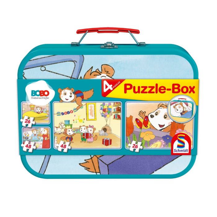 Bobo Siebenschläfer: Puzzle-Box im Metallkoffer mit 4 Kinderpuzzles (2 x 26 und 2 x 48 Teile)