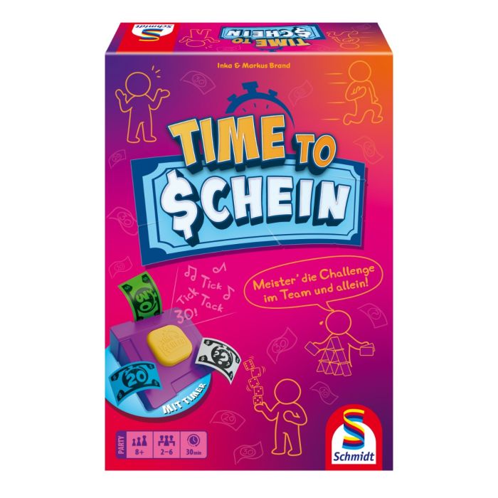 It‘s TIME TO SCHEIN! Gemeinsam versucht ihr die verschiedensten Challenges von einfach bis verrückt – mal allein, mal im Team – zu meistern. Entscheidet zusammen, wer sich der Herausforderung stellt und wie viel Zeit ihr benötigt! Füttert den sprechenden Timer mit Scheinen, denn für jeden Dollar erkauft ihr euch eine Sekunde für die Challenge. Als Team stehen euch aber nur eine gewisse Anzahl an Scheinen zur Verfügung um 5 Challenges zu bestehen. Lieber etwas mehr ausgeben und auf Nummer sicher gehen, oder mit knapper Zeit zocken? Wie gut schätzt ihr euch ein? Jetzt ist nicht die Zeit zum Verlieren!